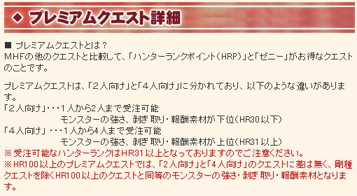HR100以上のプレミアムクエストでは、「2人向け」 と 「4人向け」 のクエストに差は無く、剛種クエストを除くHR100以上のクエストと同等のモンスターの強さ・剥ぎ取り・報酬素材となります。