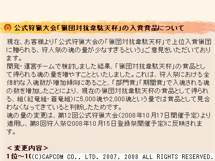 ぬか喜びじゃん。 狩人祭に反映される魂数が増えただけってことね。 まぁ、猟団対抗で上位に入れないこっちとしてはありがたいけど。 100位猟団のラインは現状維持だからね。