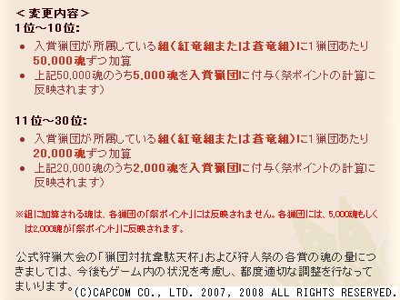 上記50000魂のうち、5000魂を入賞猟団に付与