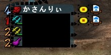 ガード性能+2、切れ味ゲージ+1、体力回復アイテム強化、激運。