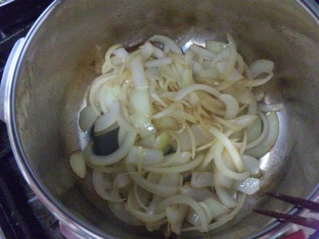 まず、さっきの材料から玉ねぎだけ炒めてー。