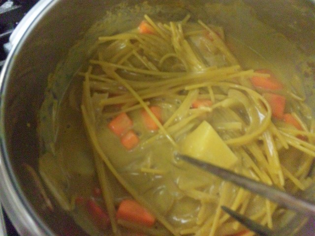 水、牛乳、グラタンソースとスパゲティを入れて煮込みー。