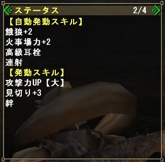 攻撃特大、見切り3、火事場2、餓狼2、高級耳栓、切れ味+1、